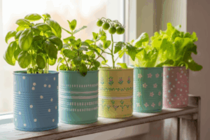 - Latas e potes: lixe bordas, faça furos e use como cachepôs charmosos para ervas.